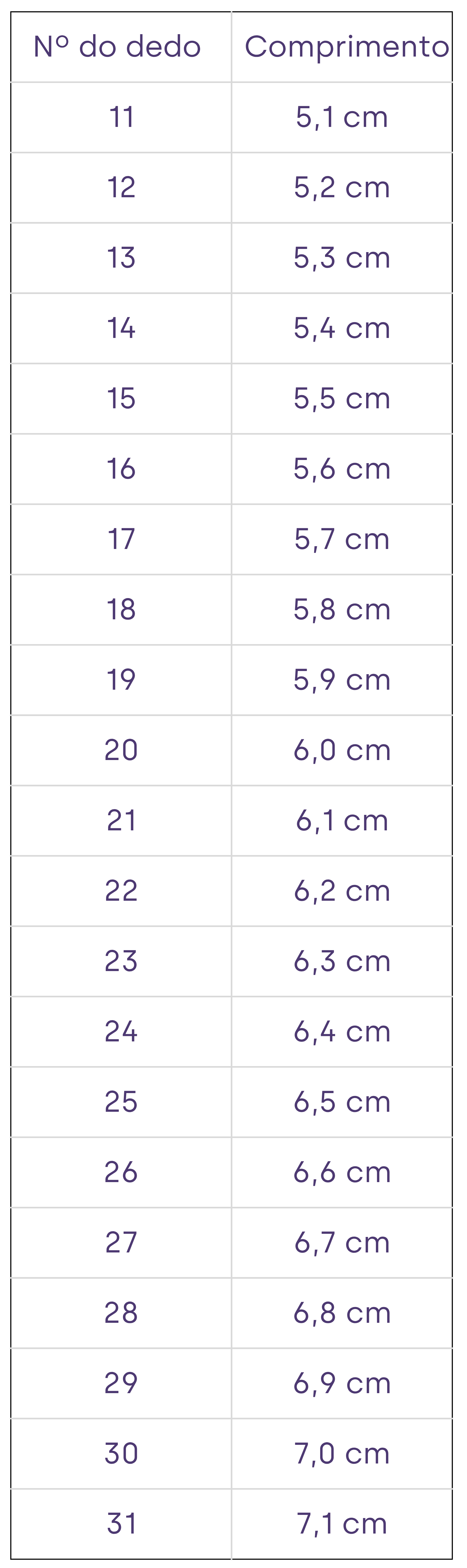 Conferir na tabela a seguir o teu tamanho de anel: