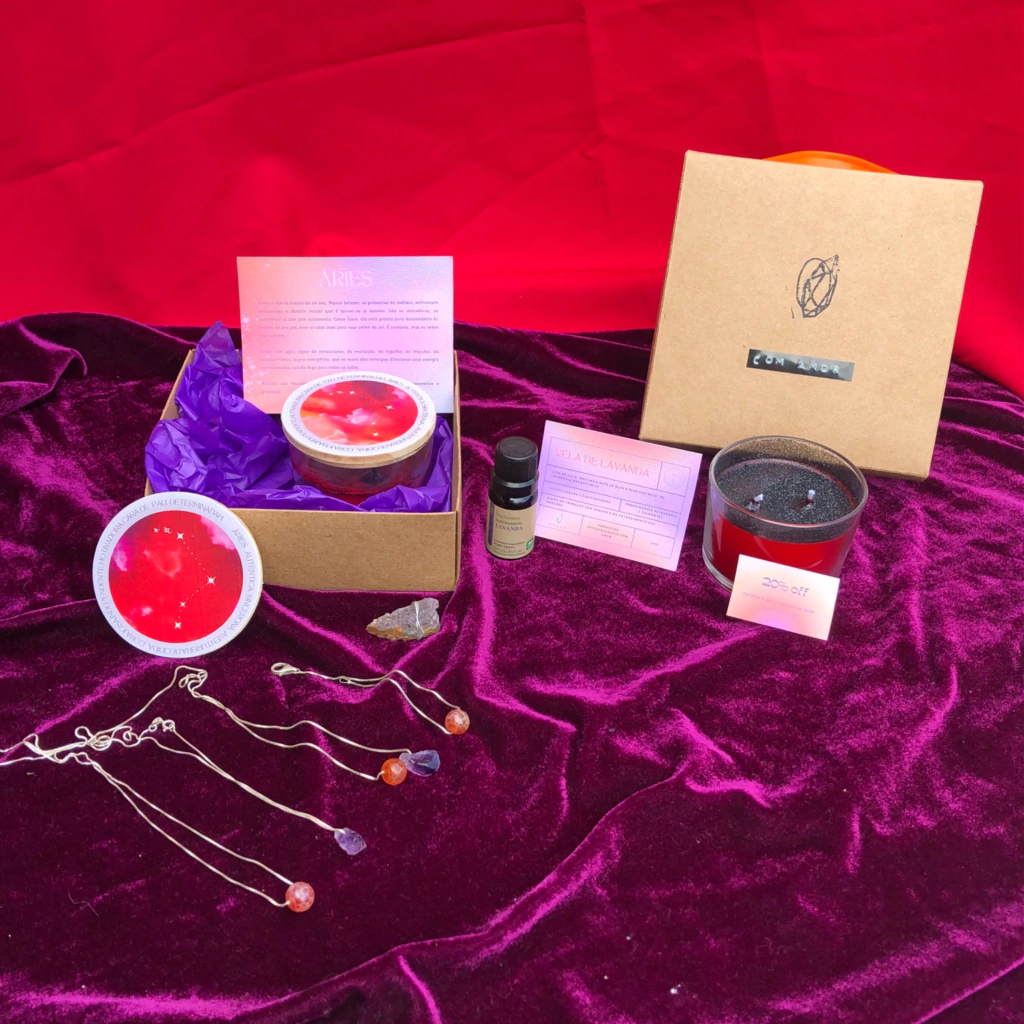 A Box de presente acompanha um card sobre o signo de Áries, um VALE PRESENTE de 20% off na consulta da revolução solar com a @claraastro e uma vela de lavanda, que traz calma e equilíbrio e vai ajudar nossas maninhas nos momentos de ansiedade para dar uma descansadinha.