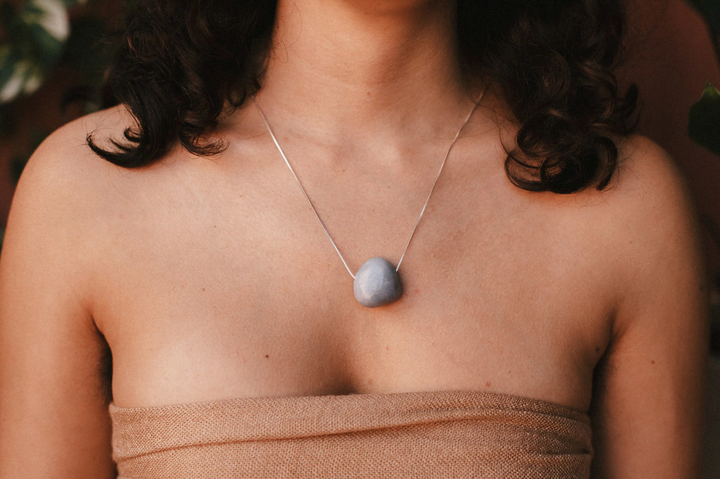 A modelo tem 1,65cm e a corrente que esta no amuleto tem 50cm