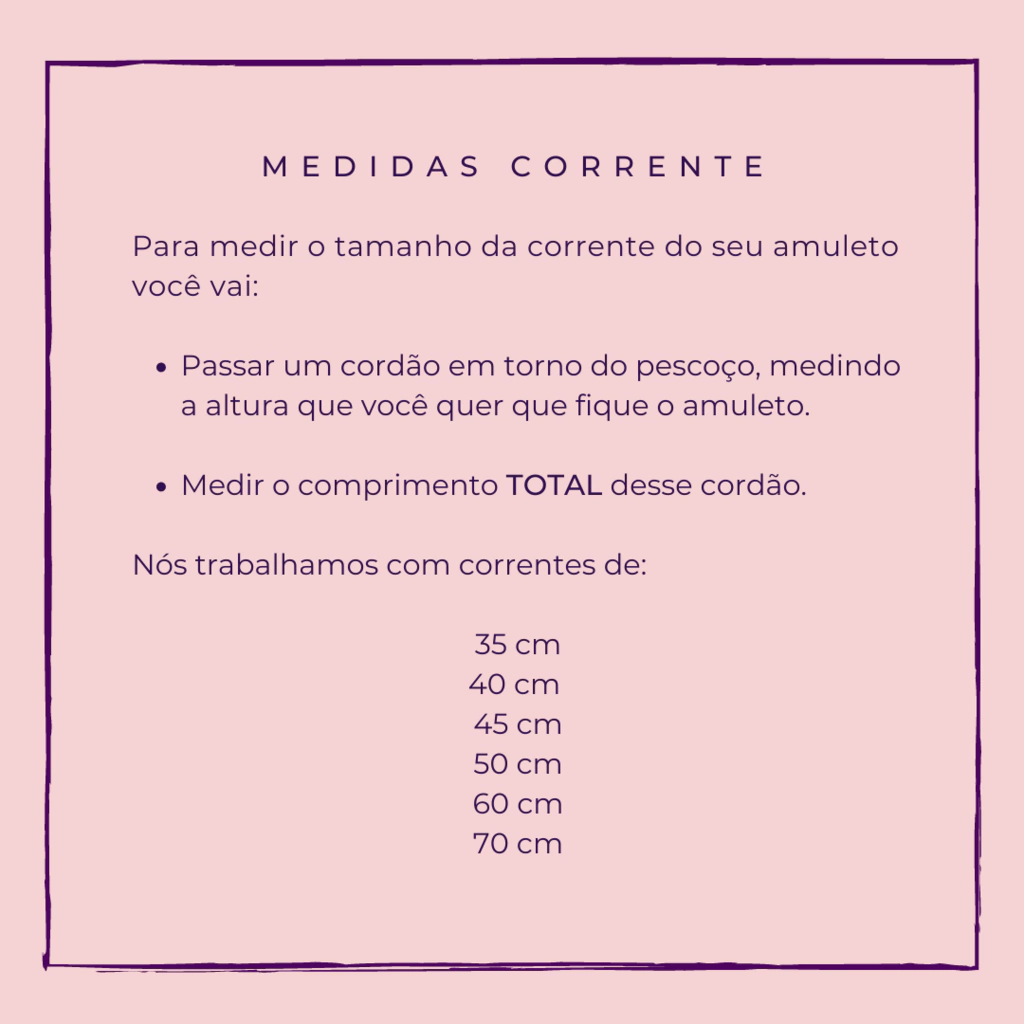 A modelo tem 1,650 de altura e está usando um amuleto com corrente de 40cm