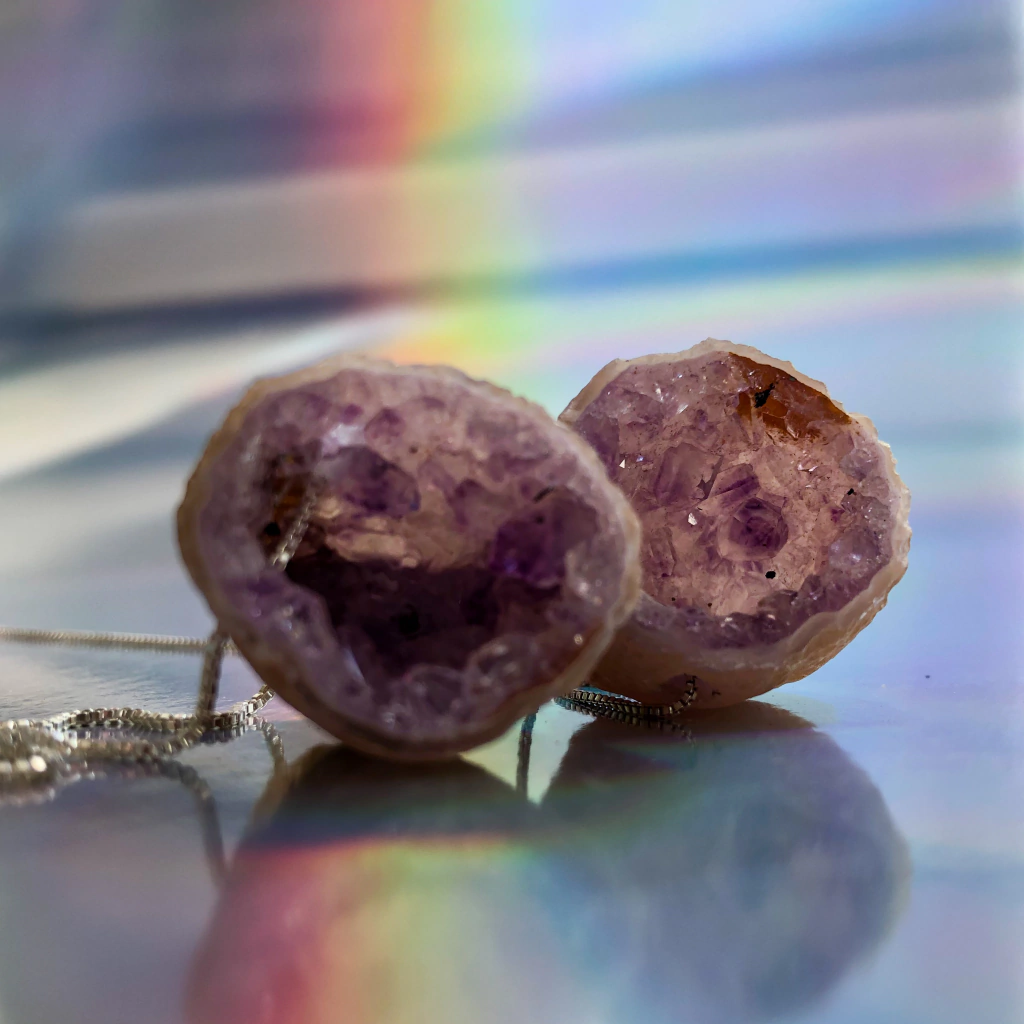 A Ametista é uma poderosa pedra de proteção e elevação da alma. Associada a transmutação, espiritualidade e conscientização, nos auxilia a lidarmos com energias densas, maus hábitos, pensamentos negativos e situações adversas, transmutando essas energias negativas em força de ação para mudança. É uma mana sabia e conselheira, que inspira o equilíbrio e harmonia, conforta e encoraja, estimulando que tratemos corpo e mente como templos sagrados. Ela expande a percepção para superação de desafios, o que propicia a acolher as mudanças da vida e encarar o desconhecido, dando leveza a esses processos. Por possuir propriedade calmante, ela auxilia a entrar no estado de meditação e consciência elevada, sendo útil no tratamento de insônia e ansiedade, contribuindo para paz interior. Mana bruxona, inspira o sexto sentido, a compreensão mágica do universo, apurando a sensibilidade mística e espiritual, estimulando a intuição e insights e elevando os poderes de quem a usa. Poderosa para o trabalho com sonhos, fertiliza a mente e ajuda na interpretação dos mesmos.